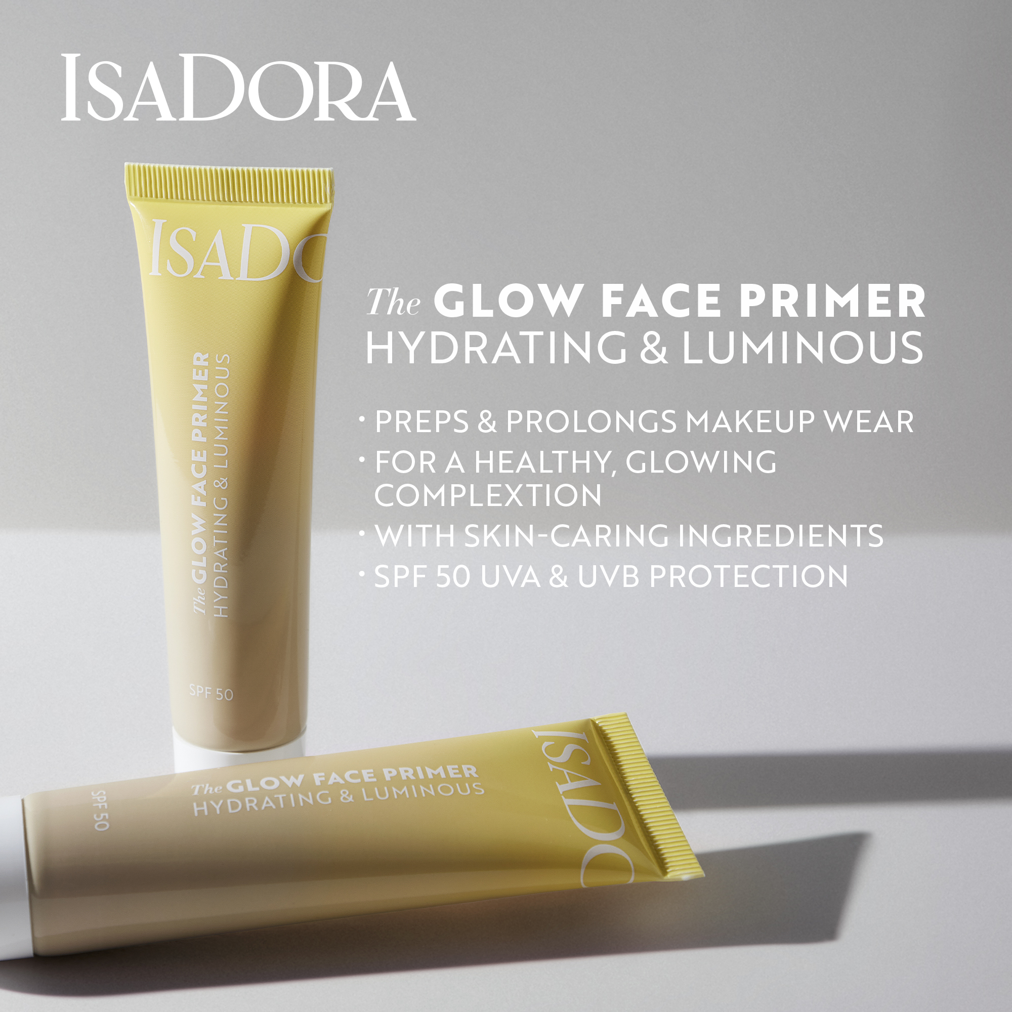 Hidratantni i zaštitni primer sa SPF 50, njegujućim sastojcima i blistavim završetkom.